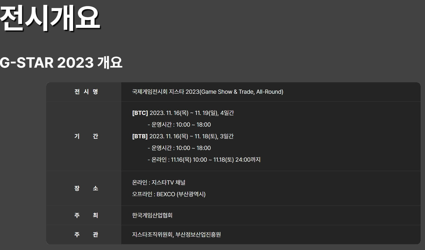 지스타 2023은 2023년 11월 16일부터 2023년 11월 19일까지 BTC